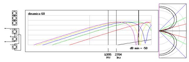 Il tweeter scelto per realizzare la tripletta misura solo 53 millimetri di diametro e complessivamente la tripletta occupa una ventina di centimatri (la metà del CLD). La figura che segue mostra la dispersione verticale dela Tripletta. L’area di radiazione nulla si estende su un angolo di 30 gradi e non si vedono minimi secondari alle frequenze di interesse. Le caratteristiche della tripletta sono del tutto simili a quelle del CLD con il vantaggio che la tripletta può essere applicata anche su diffusori acustici più piccoli.